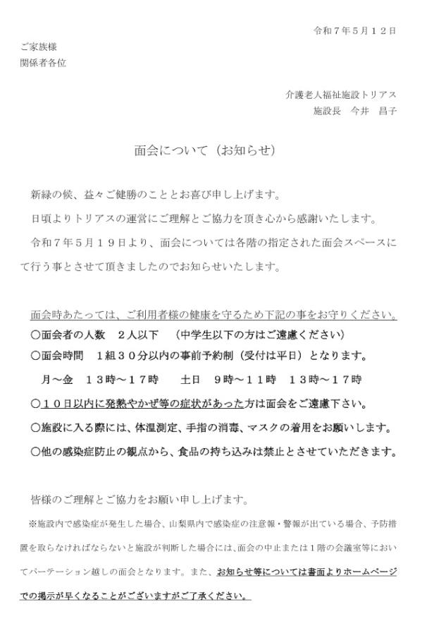 入所施設の面会についてのご連絡
