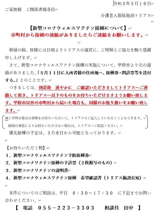トリアス特養入所者様への新型コロナウィルスワクチン接種について